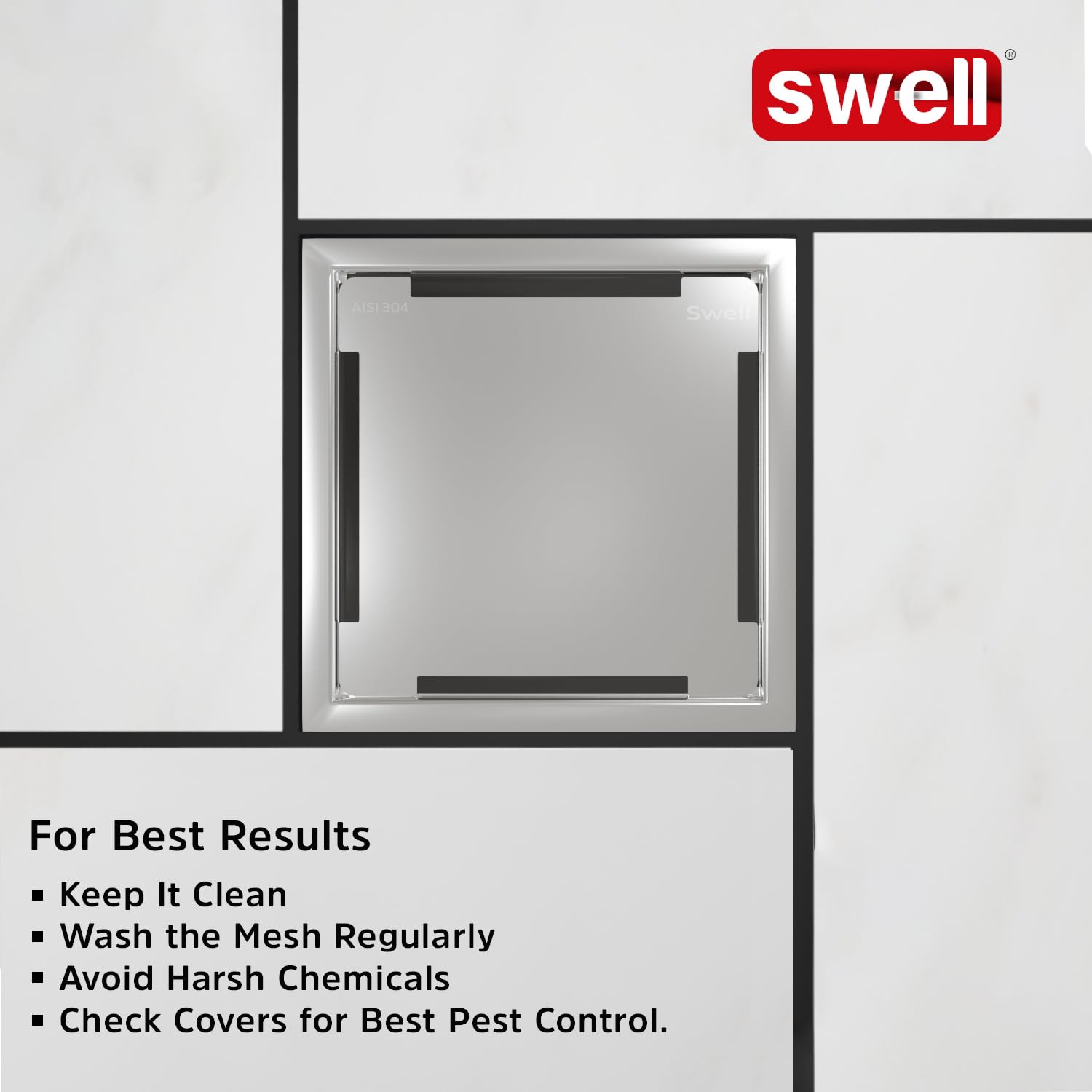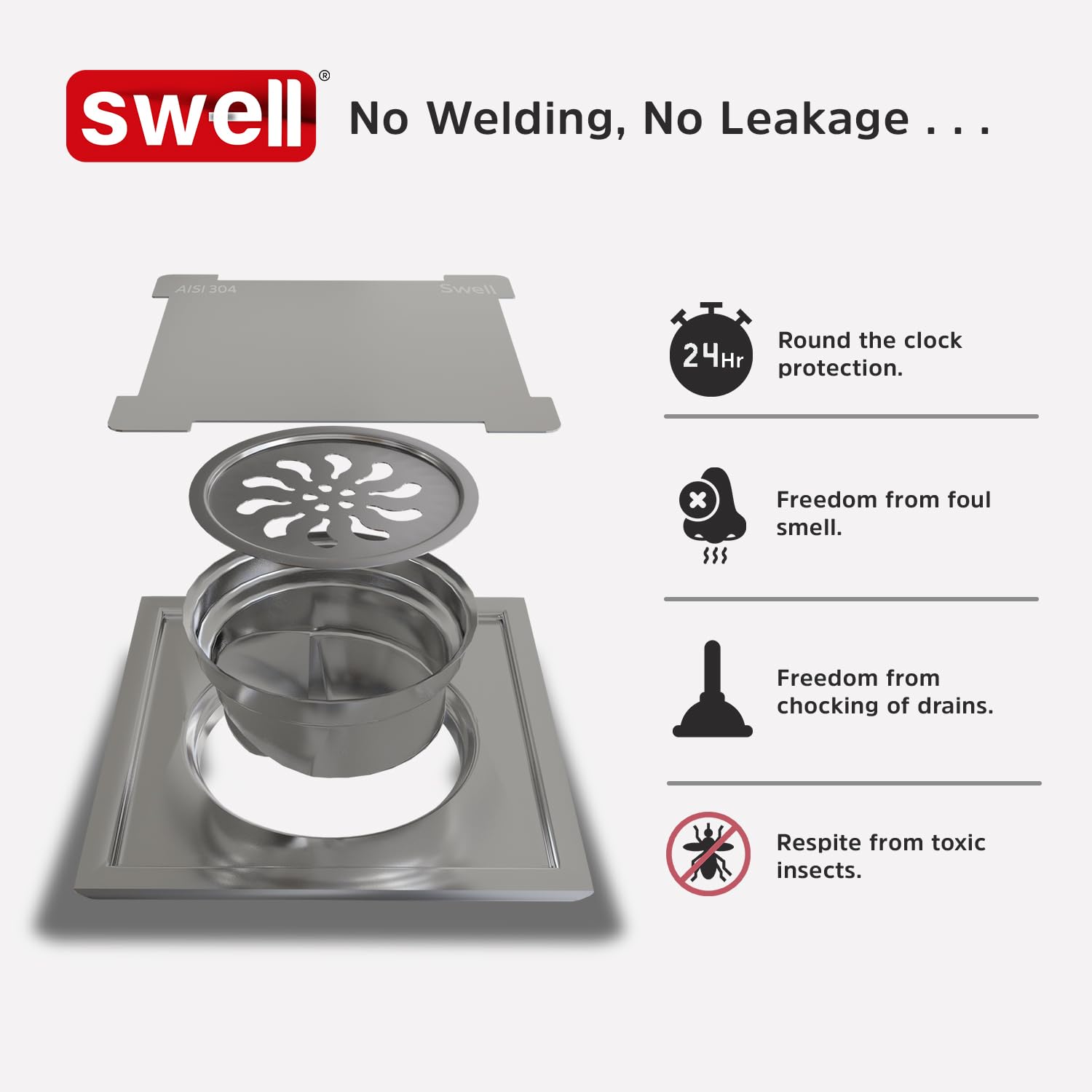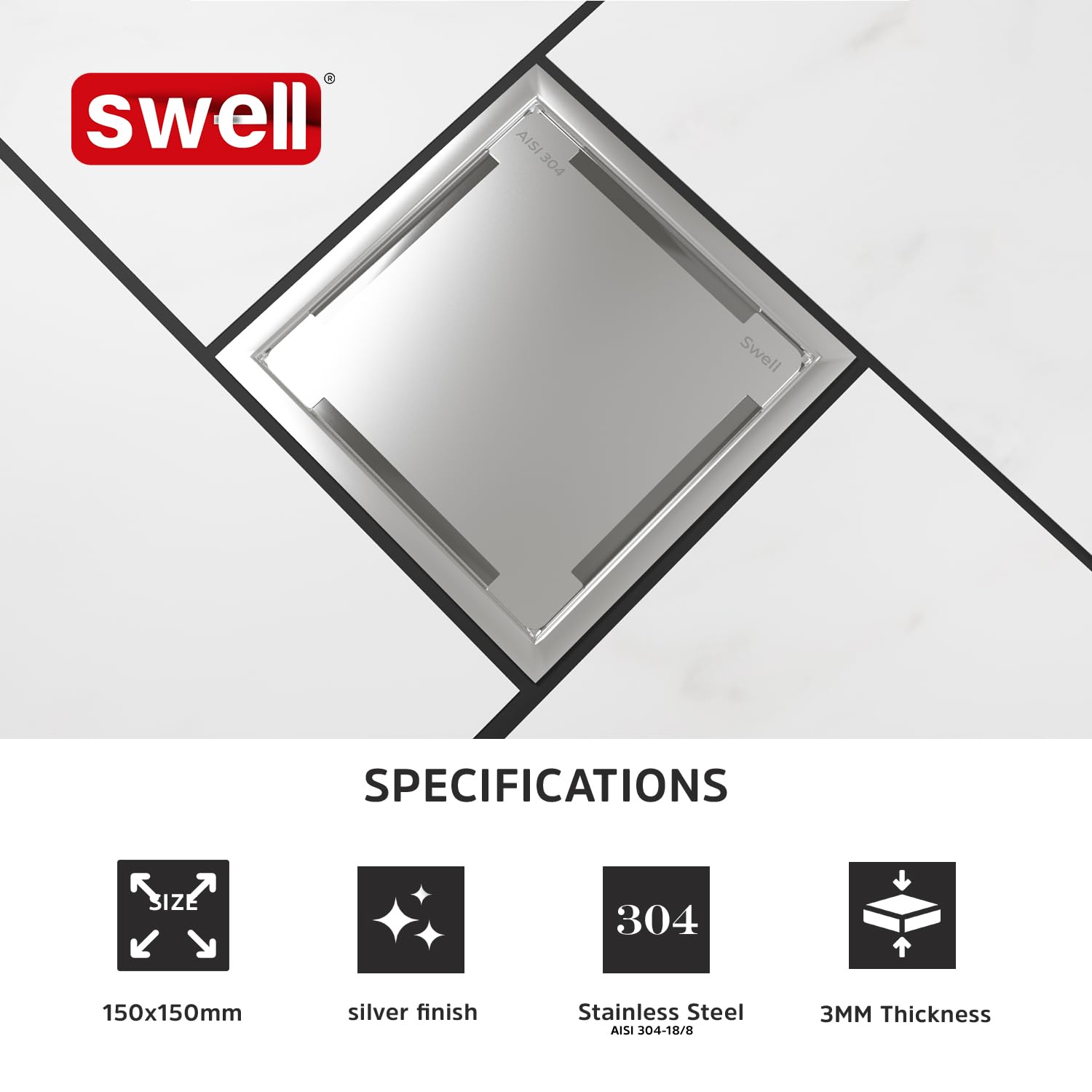 Introducing The SWELL Premium Floor Trap, Designed With A Sleek 15x15 Cm Square Shape And A Height Of .5 Cm From Top To Bottom. Crafted For Seamless Installation, It Offers A No-Welding, No-Leakage Guarantee. Made From High-Grade 304 Stainless Steel With A Satin Finish, It Combines Functionality With Elegance.