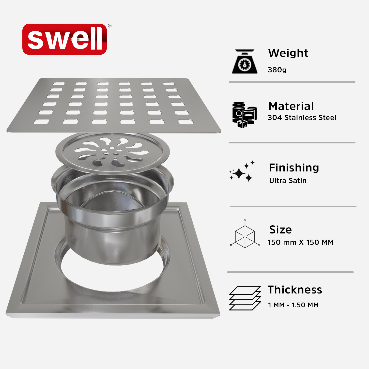 Introducing The SWELL Premium Floor Trap, Designed With A Sleek 15x15 Cm Square Shape And A Height Of .5 Cm From Top To Bottom. Crafted For Seamless Installation, It Offers A No-Welding, No-Leakage Guarantee. Made From High-Grade 304 Stainless Steel With A Satin Finish, It Combines Functionality With Elegance.