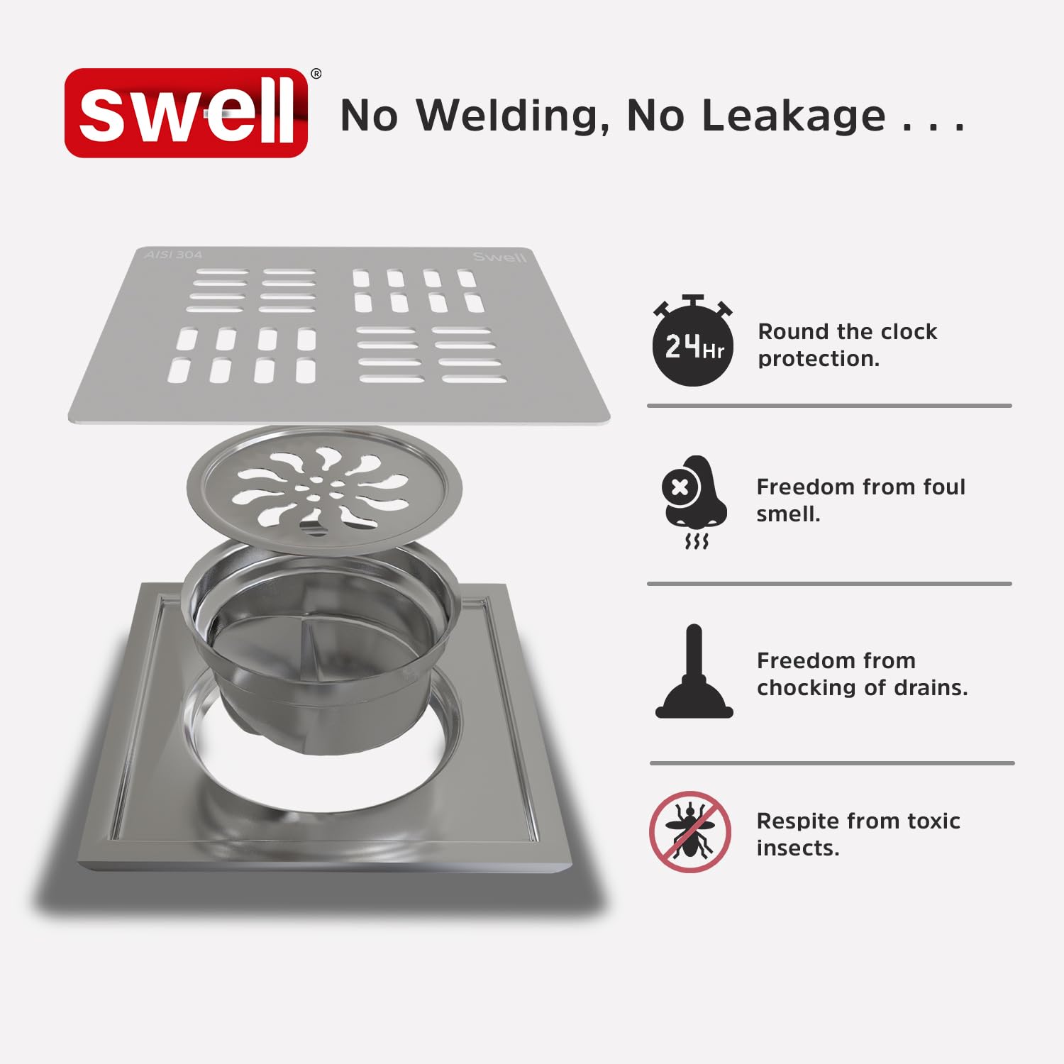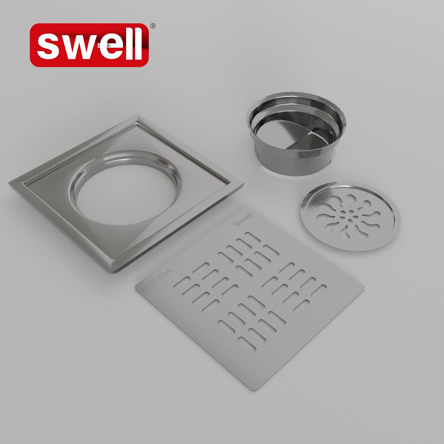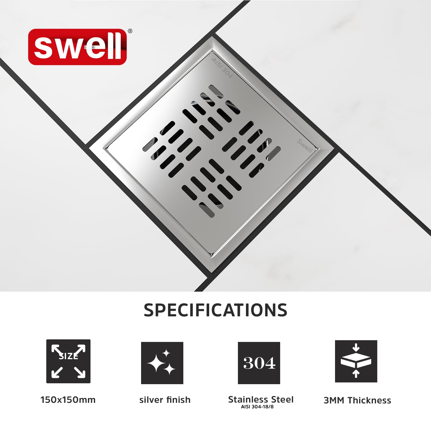 Introducing The SWELL Premium Floor Trap, Designed With A Sleek 15x15 Cm Square Shape And A Height Of .5 Cm From Top To Bottom. Crafted For Seamless Installation, It Offers A No-Welding, No-Leakage Guarantee. Made From High-Grade 304 Stainless Steel With A Satin Finish, It Combines Functionality With Elegance.
